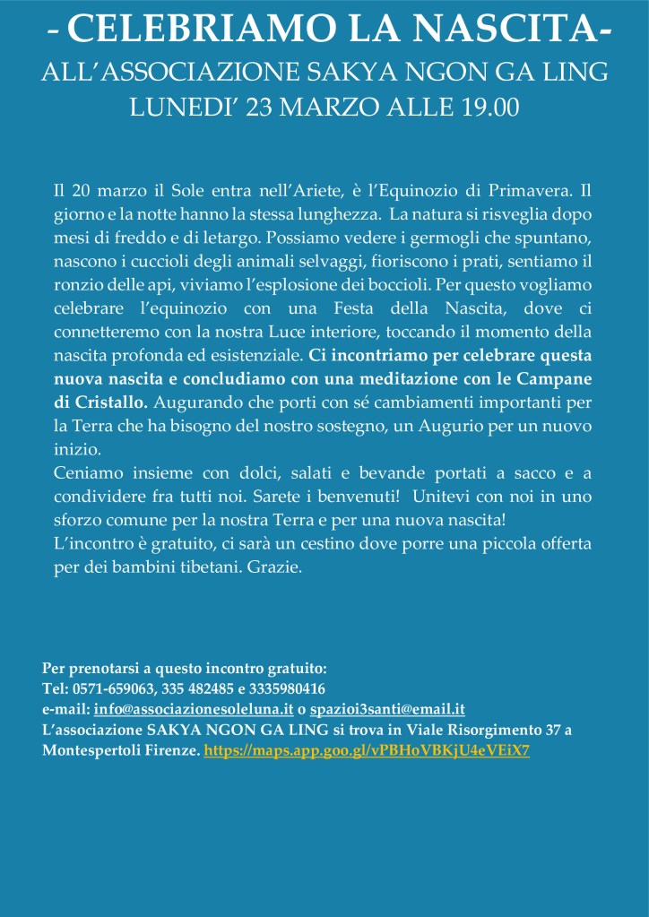 Per info potete andare alla nostra pagina Facebook “Sakya Ngon Ga Ling”, scrivere una mail a: info@sakyangongaling.it o chiamare allo 0571-659063 /335-482485 o 347-3460064.